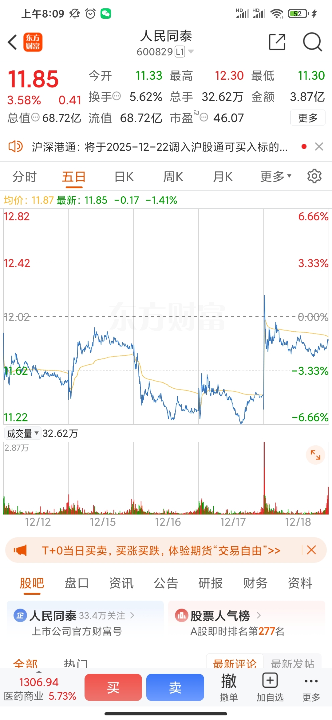 $人民同泰(SH600829)$