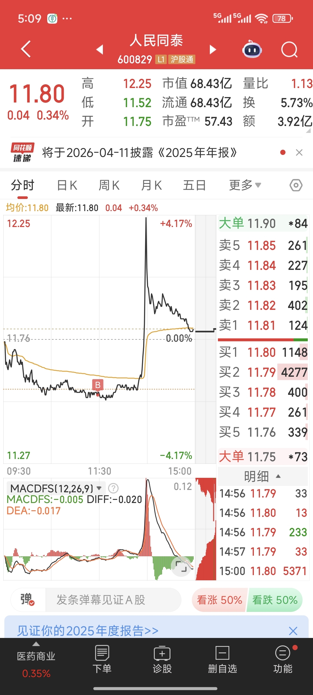 $人民同泰(SH600829)$ 买了20个 不知道明天冲高能赚多少走