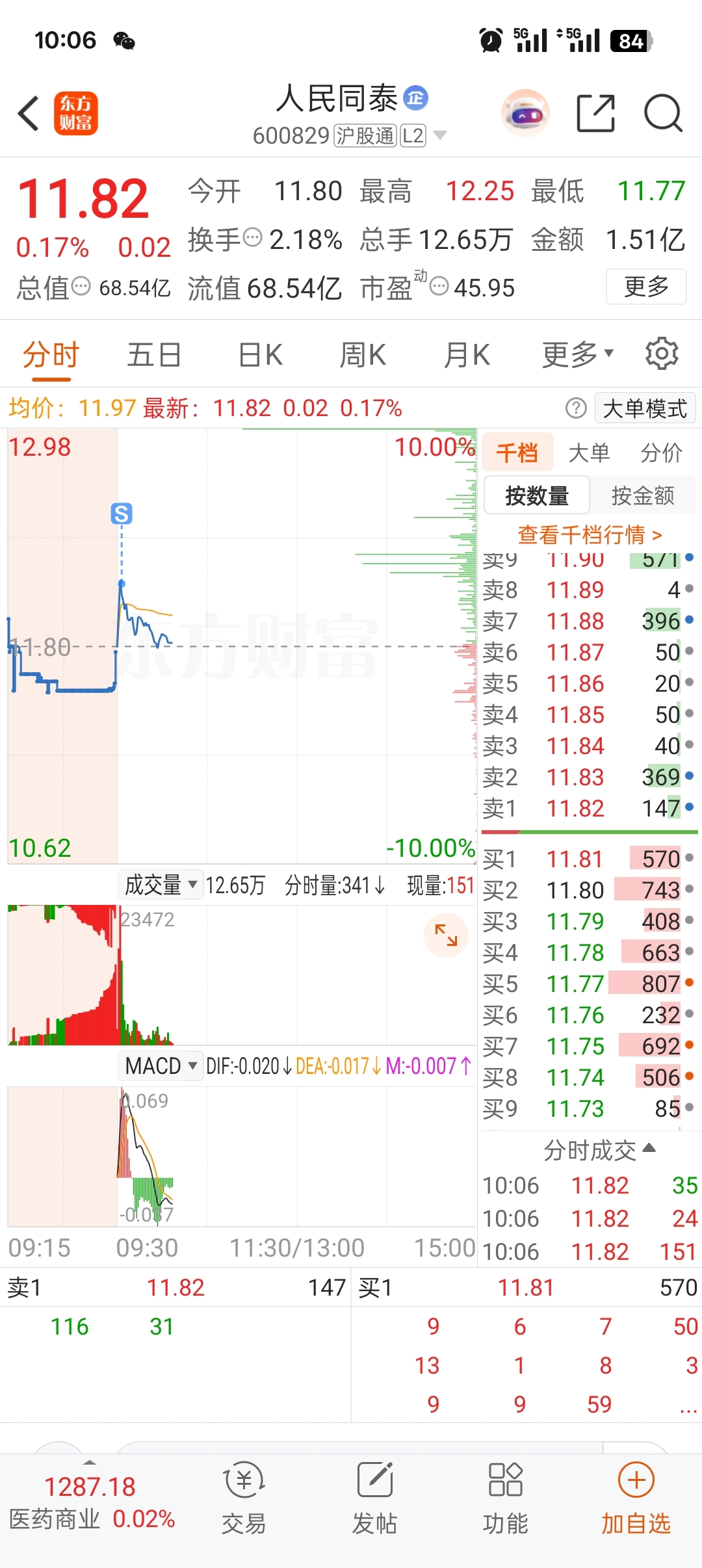 $人民同泰(SH600829)$ 昨天山顶买的,今天跑路,不靠谱
