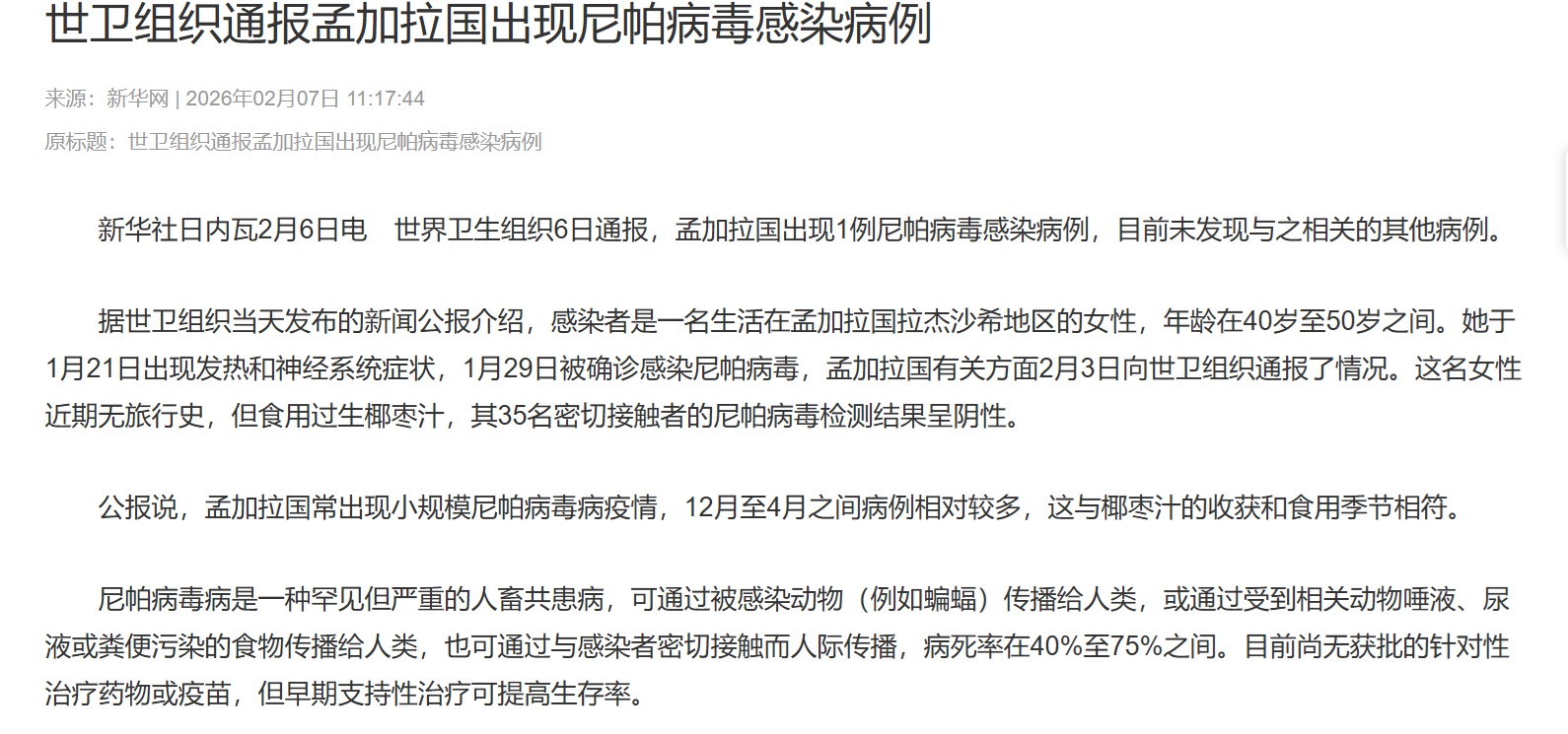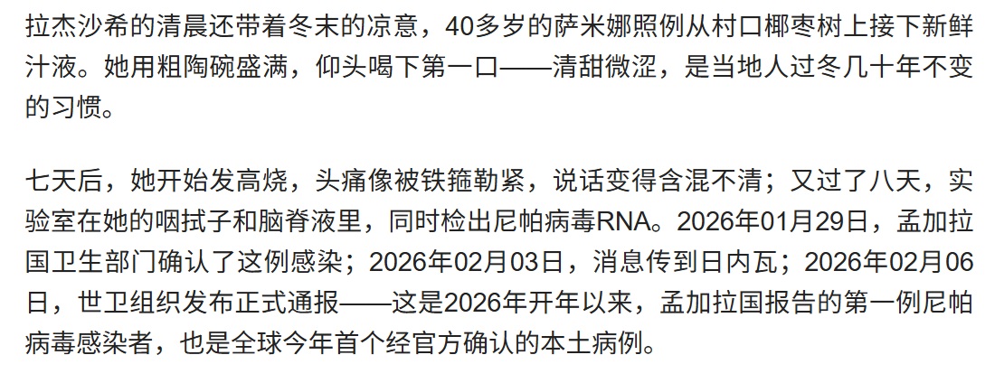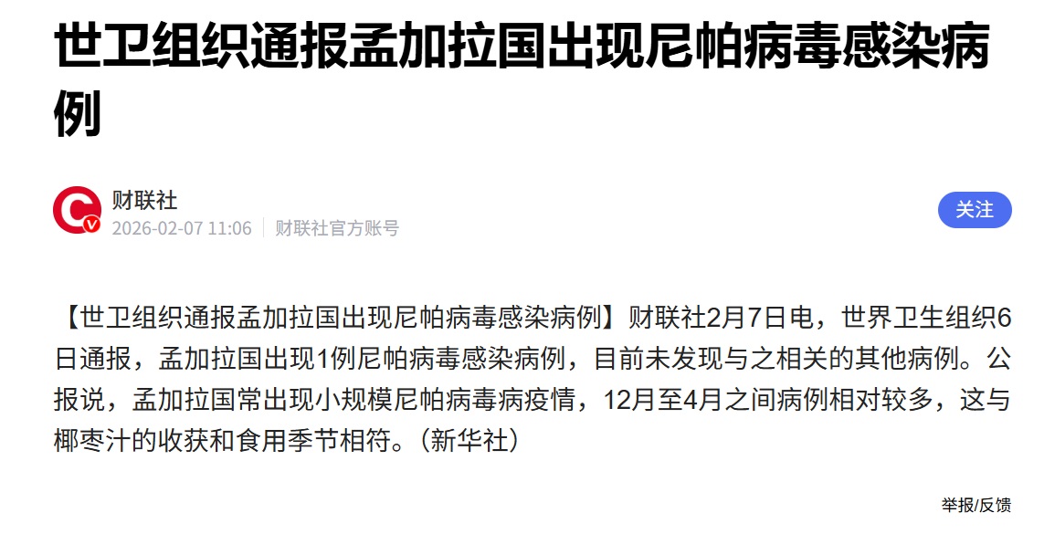 财联社-央视-新华社2月6日孟加拉国出现尼帕病毒感染病例