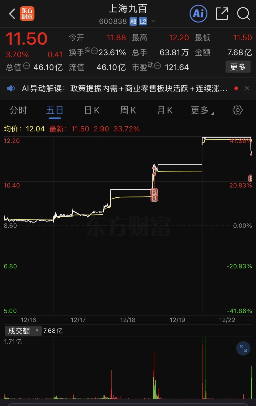 $上海九百(SH600838)$ 百大被异动限制,东百龙头高位不会A杀,低位的九百还是潜力巨大
