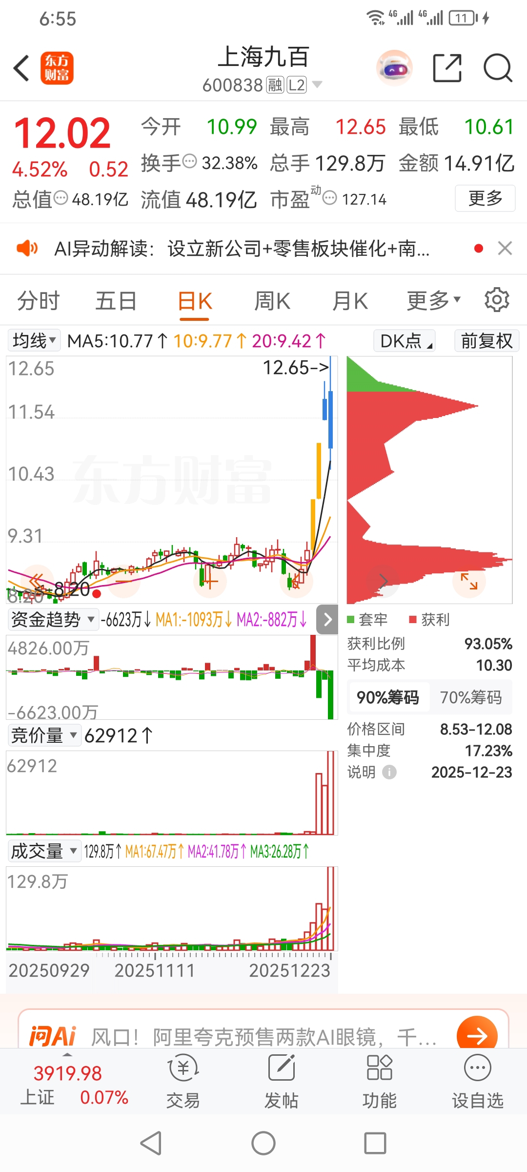 方军预期二板,竞价买进,上海九百