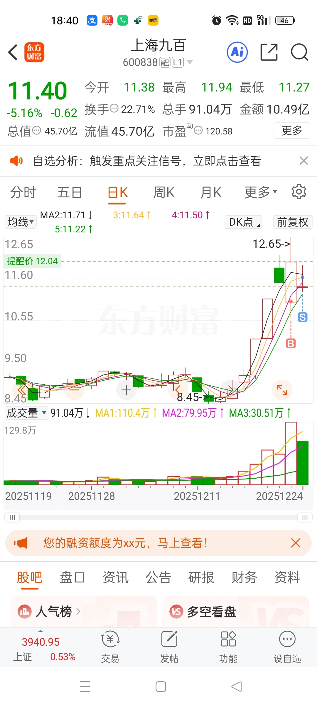 $上海九百(SH600838)$ 昨天看起来很牛,其实也只赚几个点,今天别的普涨也有几个点