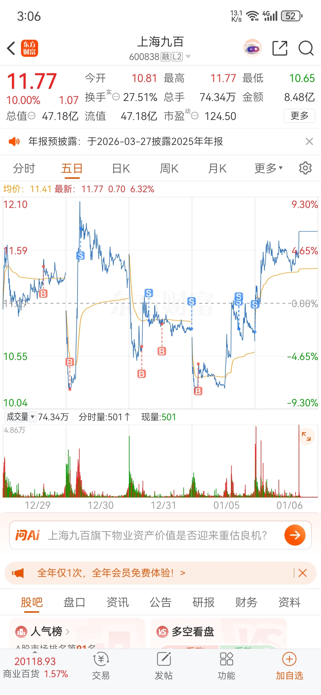 $上海九百(SH600838)$ T飞了,还以为像上次高开2个点直接下杀-6,搞得集合竞价卖了,