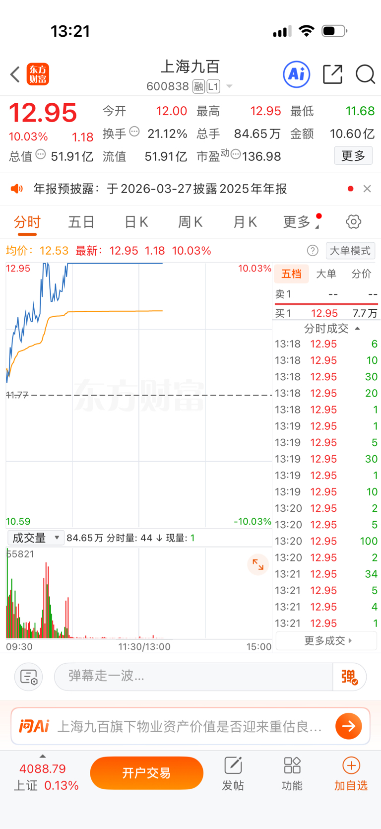 $上海九百(SH600838)$ 忙了一个上午 终于可以休息一下发一下文章 早上说的上海九百已经板了 可惜我的资金还在药易购上