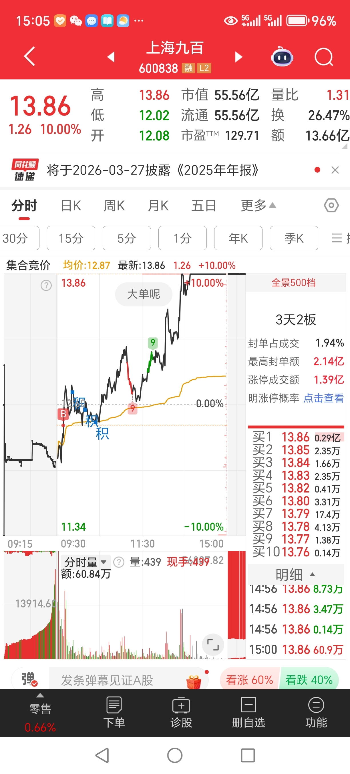 $上海九百(SH600838)$ 龙头确立,早盘梭哈