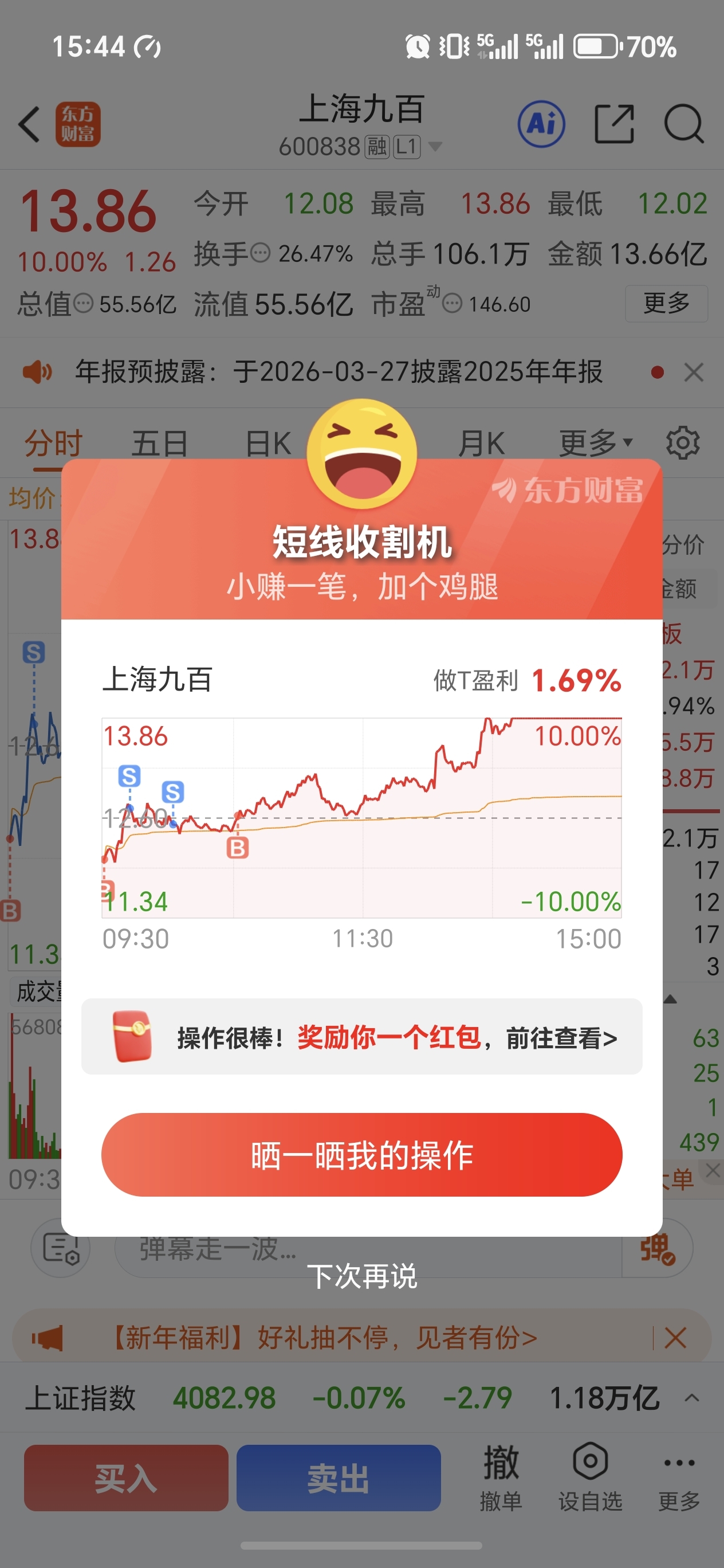 $上海九百(SH600838)$ 这玩意分时不流畅,应该是量化在玩,没大游资参与,明天割