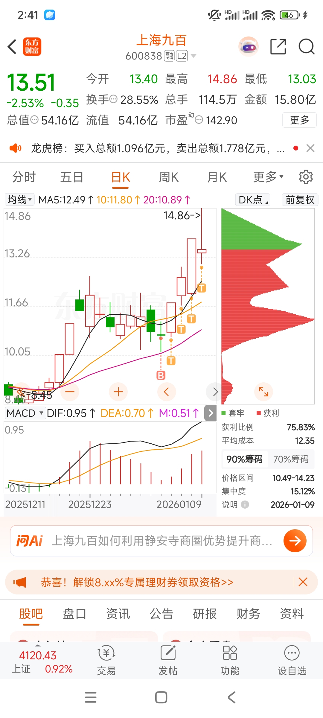 $上海九百(SH600838)$ 九百是我赚的最多的票,其实我是看好有三浪的,但是周一有个好价格我还是要走的,感谢九百!希望周一给个好点的价格吧!