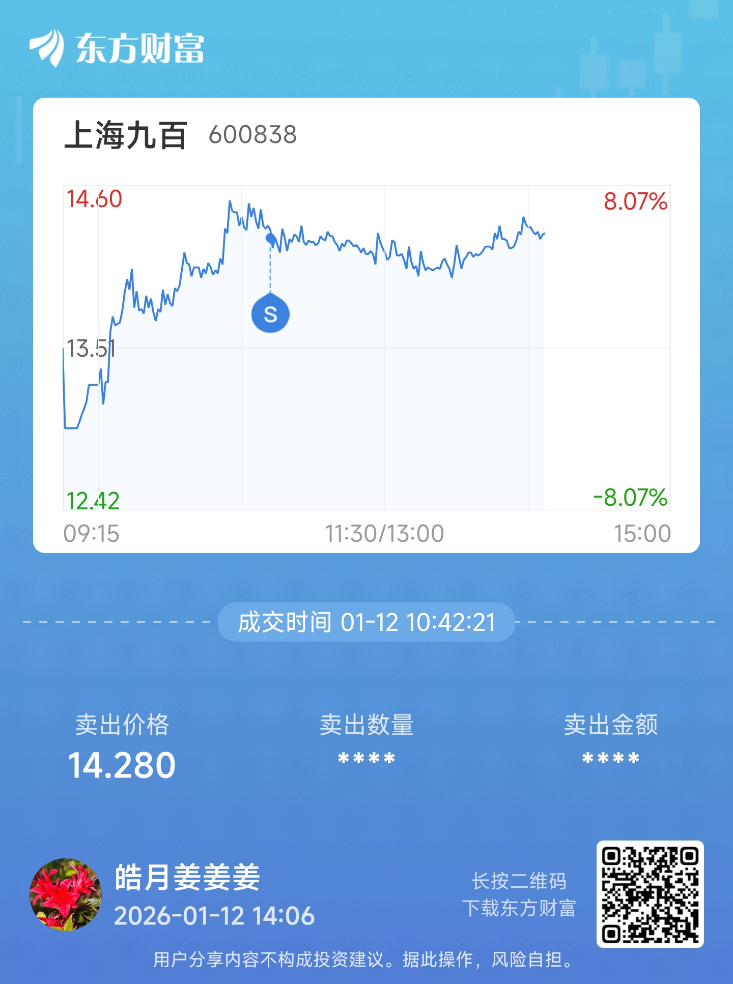 $上海九百(SH600838)$ 止盈了,谢谢主力大大