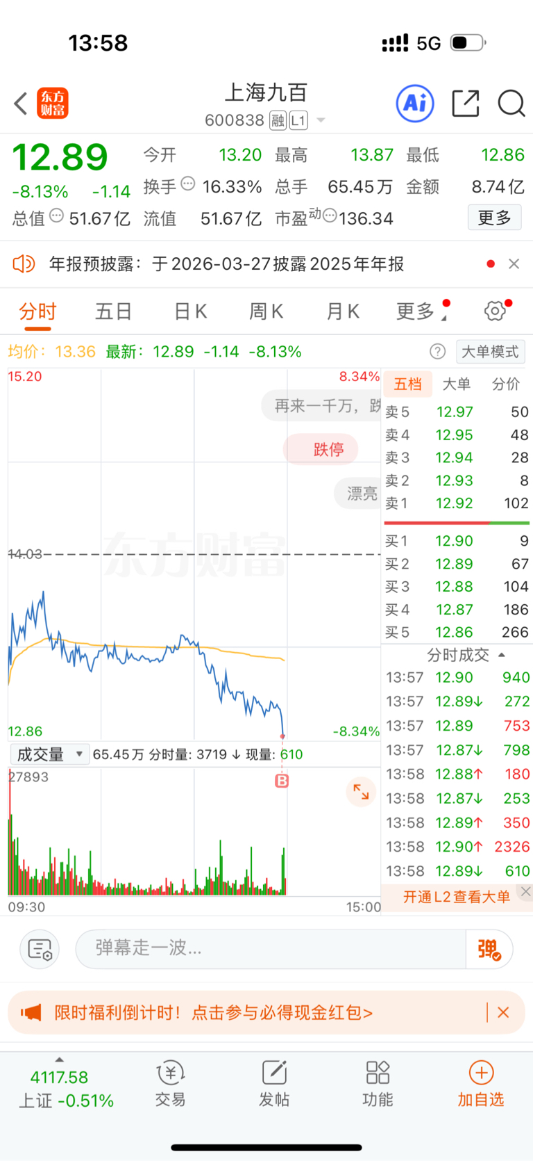 午盘选择抄底$上海九百(SH600838)$ 有想法的兄弟们可以小仓位试一下