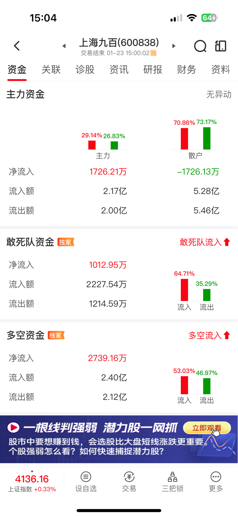 $上海九百(SH600838)$ 下午拉升13.99的时候,暗盘资金从2000万疯狂流出到绿了,尾盘集合竞价一下进了1000多万埋伏资金