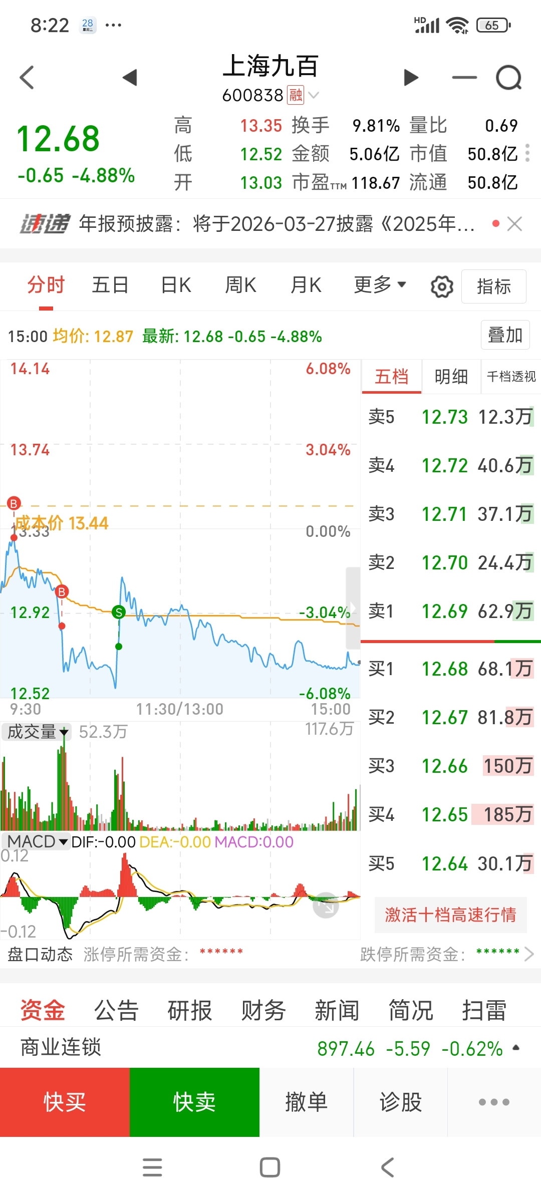 $上海九百(SH600838)$ 真是运气爆棚,红盘就那么几秒钟,被我精准加仓,真是醉了,二天没亏够,多加点亏。
