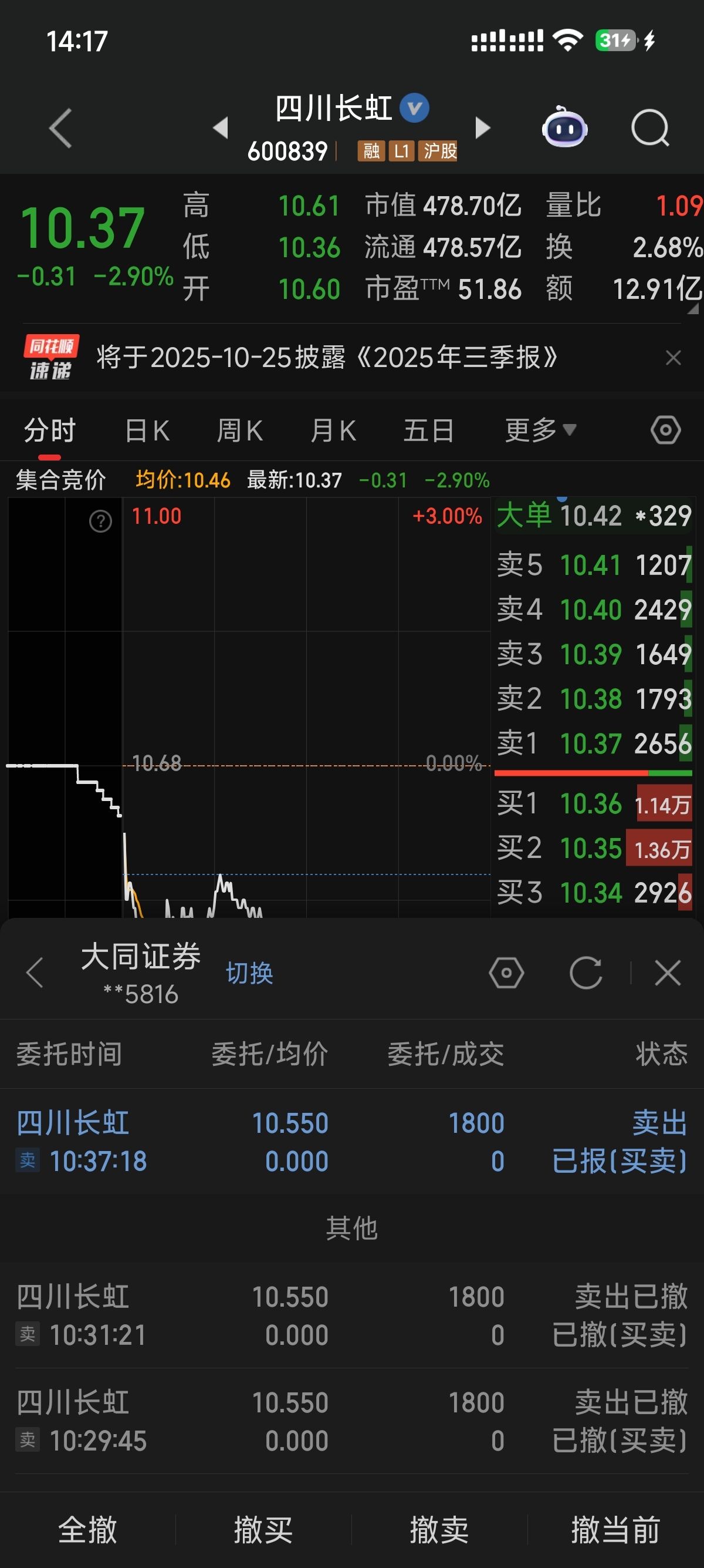 $四川长虹(SH600839)$ 今日最失败撤单操作