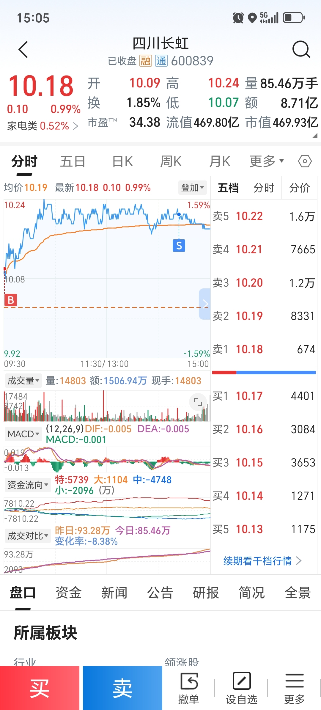 $四川长虹(SH600839)$ T了一毛,下周给我涨5个点,我要获利了结你。