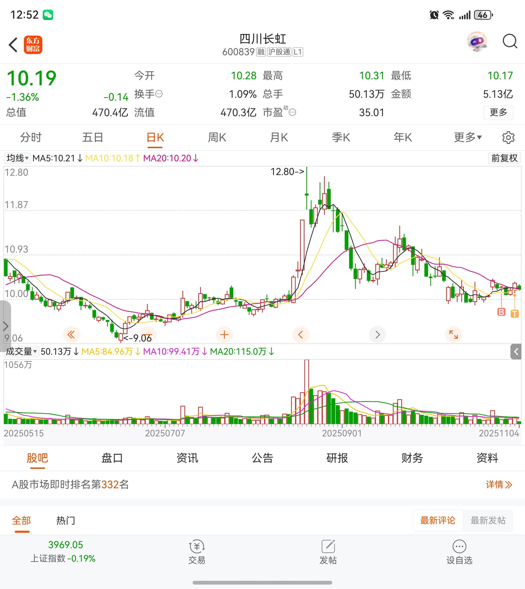 $四川长虹(SH600839)$ 明显的底部已现,地量了,明显的散户不卖了。恶心的庄想要筹码,还不想要低价筹码,想着先做空,再做多。那么好跟随你 今天不敢再跌了吧,今天加仓。明天不管绿盘还是红盘全砸给你,放心今年的底仓全是去年在长虹身上赚的。