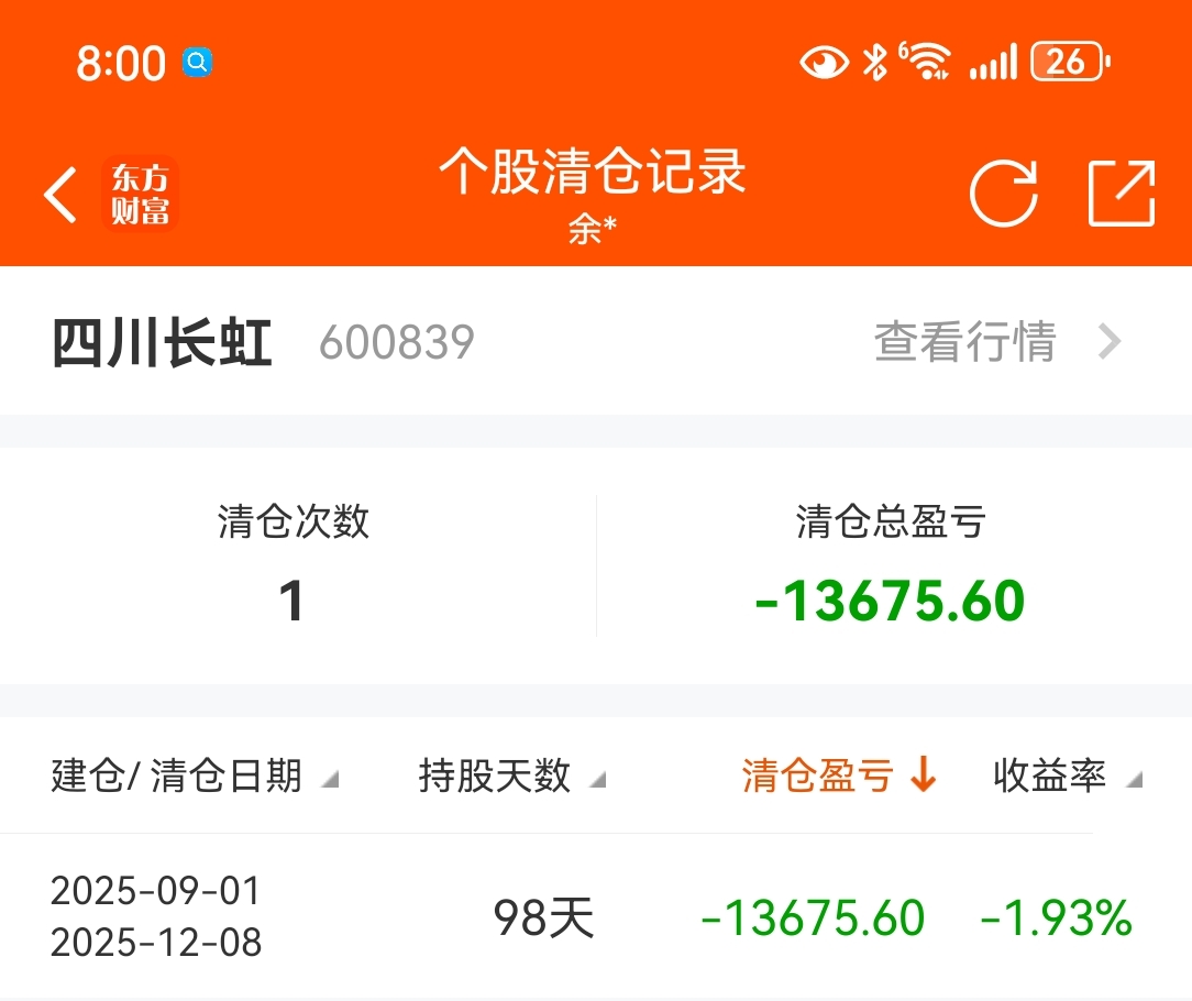 $四川长虹(SH600839)$ 98天的守候,清仓了,再见
