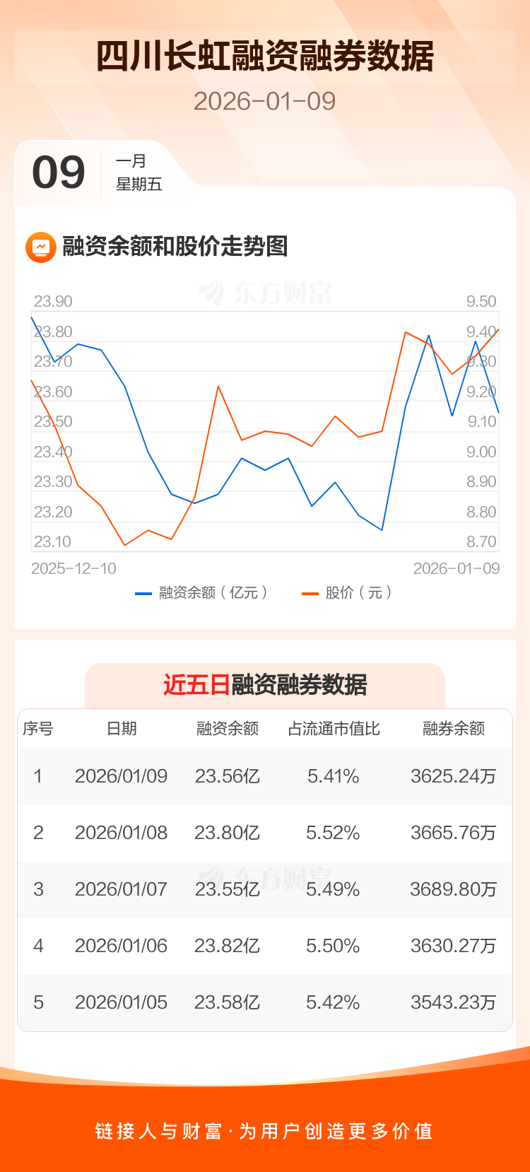 交易所最新数据显示,四川长虹于2026年1月9日获融资买入1.25亿元,融资偿还1.49亿元,当日融资净偿还2477.1万元。目前,该股融资余额23.56亿,占流通市值比例为5.41%。
