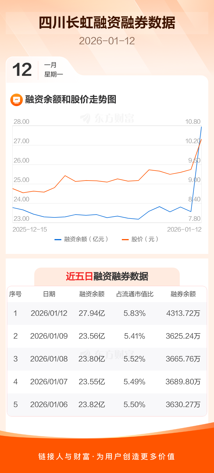 交易所最新数据显示,四川长虹于2026年1月12日获融资买入8.42亿元,融资偿还4.04亿元,当日融资净买入4.38亿元。目前,该股融资余额27.94亿,占流通市值比例为5.83%。