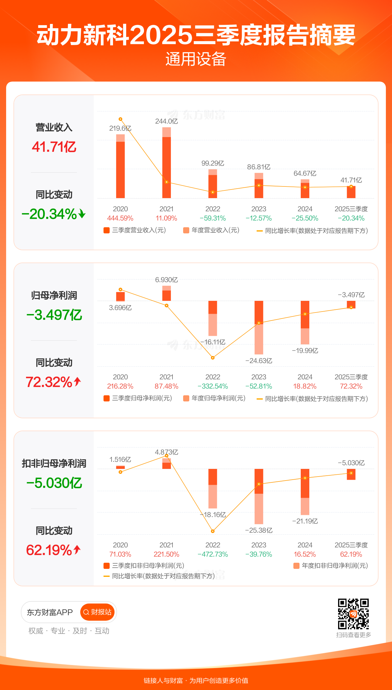动力新科10月30日发布2025年三季报显示,公司前三季实现营业收入41.71亿元,同比下滑20.34%;归母净利润-3.50亿元;扣非归母净利润-5.03亿元。