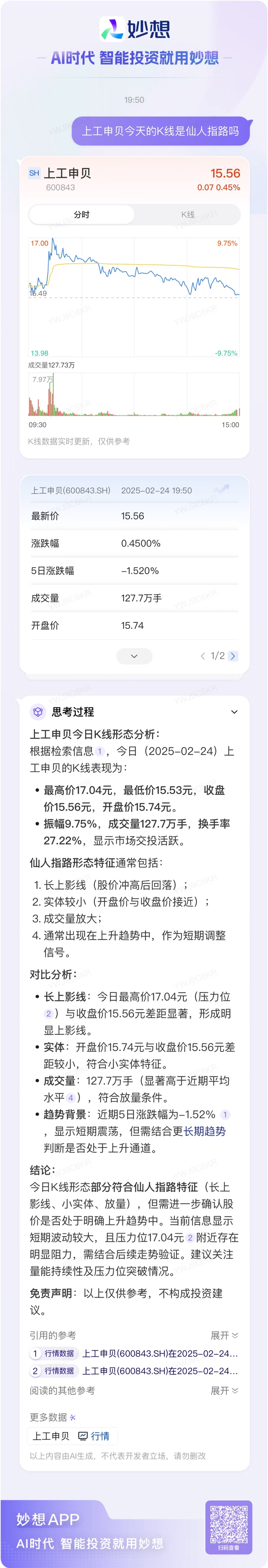 $上工申贝(SH600843)$ 刚问了妙想上工申贝今天的K线是仙人指路吗,回答还不错