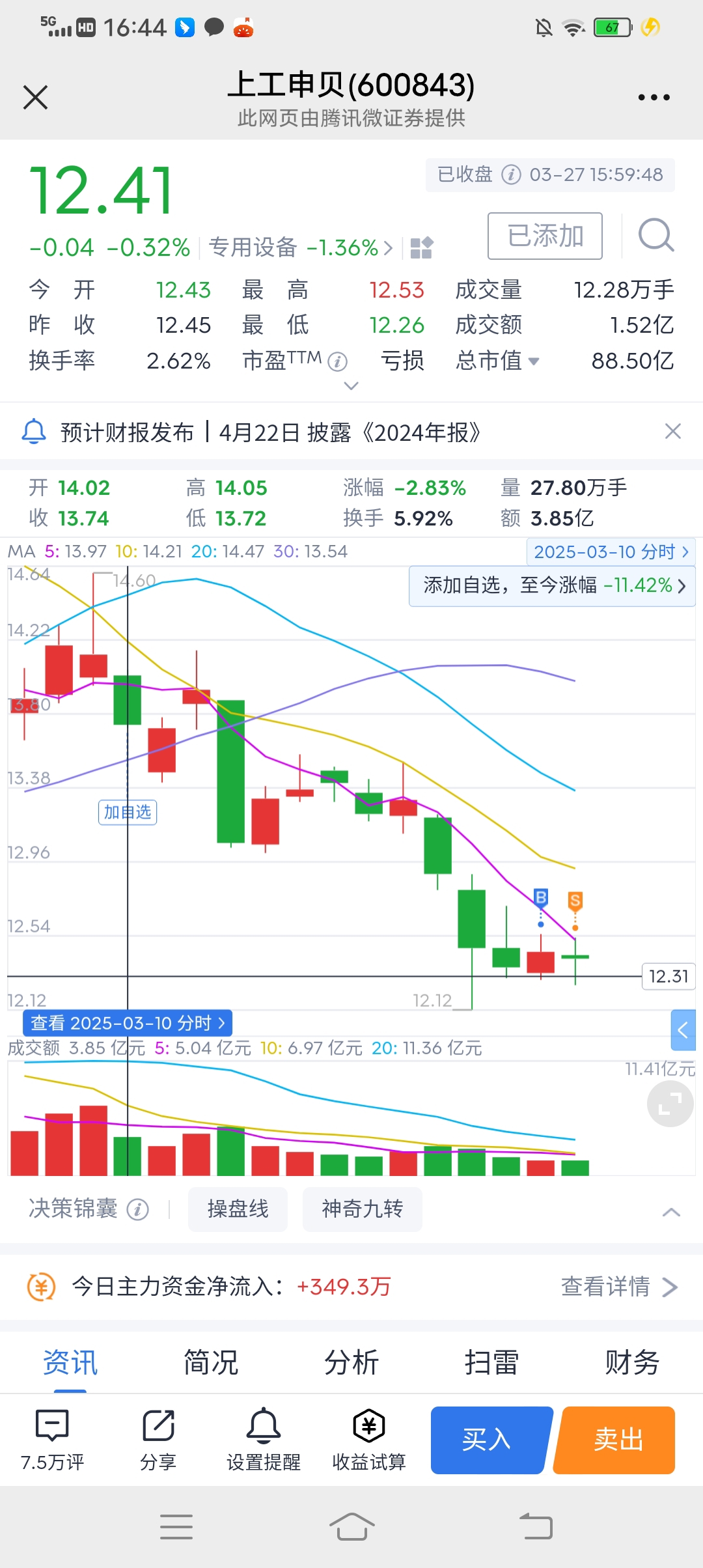 $上工申贝(SH600843)$ 加自选下跌11%想博个反弹。昨天12.45主动买套,早盘睡到9.50一看砸了个最低价没有加仓。否则能多挣点钱