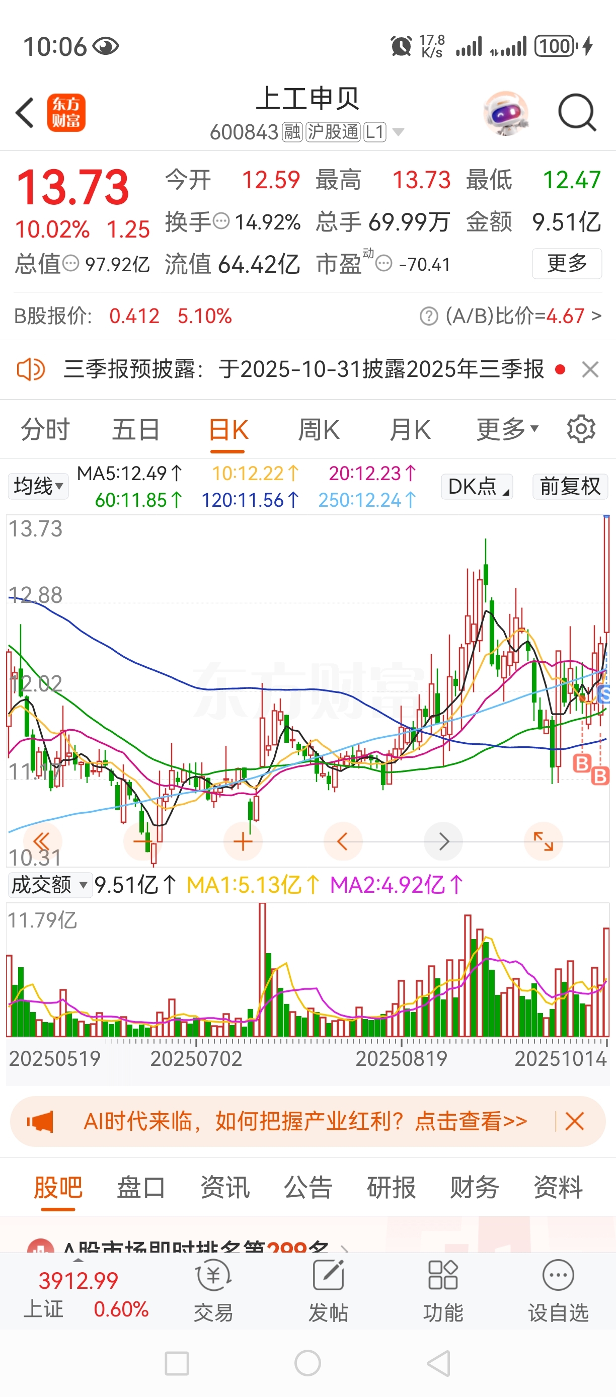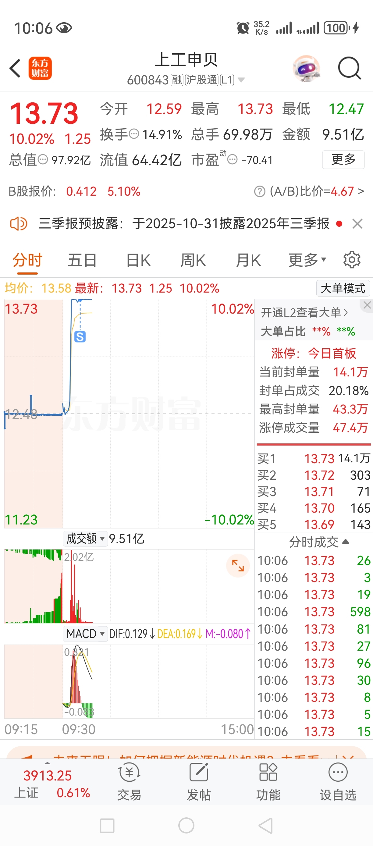 $上工申贝(SH600843)$ 出了一半,留一半跟主力冲锋#炒股日记#