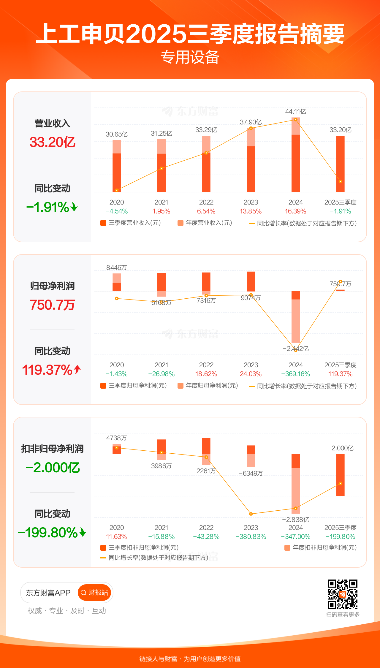 上工申贝10月31日发布2025年三季报显示,公司前三季实现营业收入33.20亿元,同比下滑1.91%;归母净利润750.69万元,同比增长119.37%;扣非归母净利润-2.00亿元。