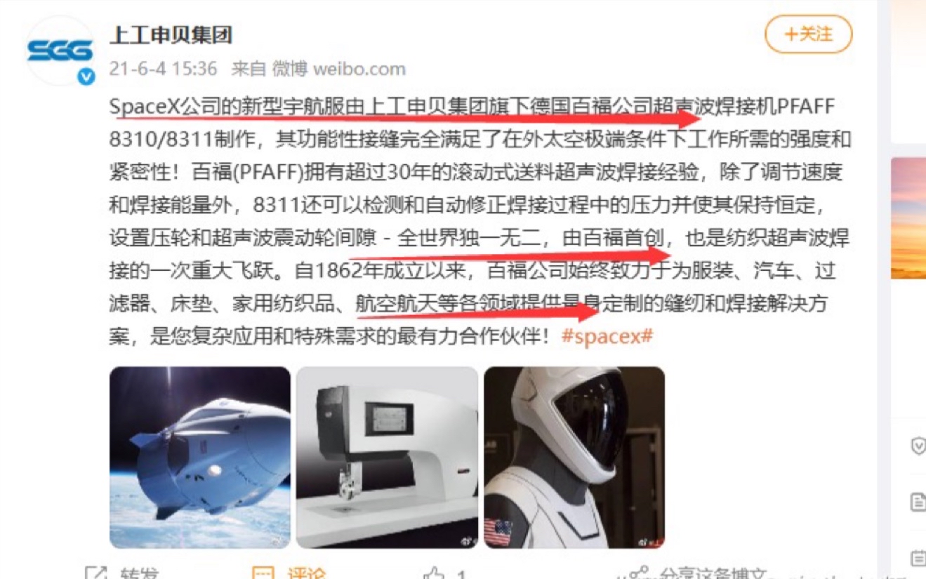 $上工申贝(SH600843)$ 合作美国最大商业航天SpaceX