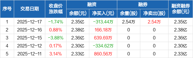 上工申贝:融资净偿还313.44万元,融资余额2.35亿元(12-17)
