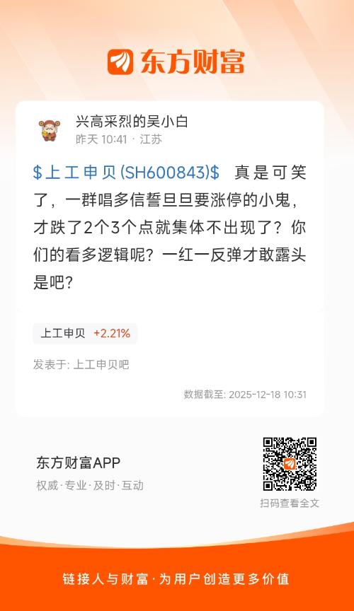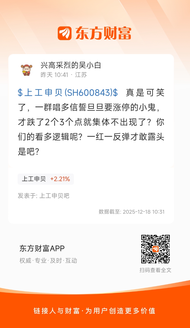 $上工申贝(SH600843)$ 真是可笑了,一群唱多信誓旦旦要涨停的小鬼,才跌了2个3个点就集体不出现了?你们的看多逻辑呢?一红一反弹才敢露头是吧?