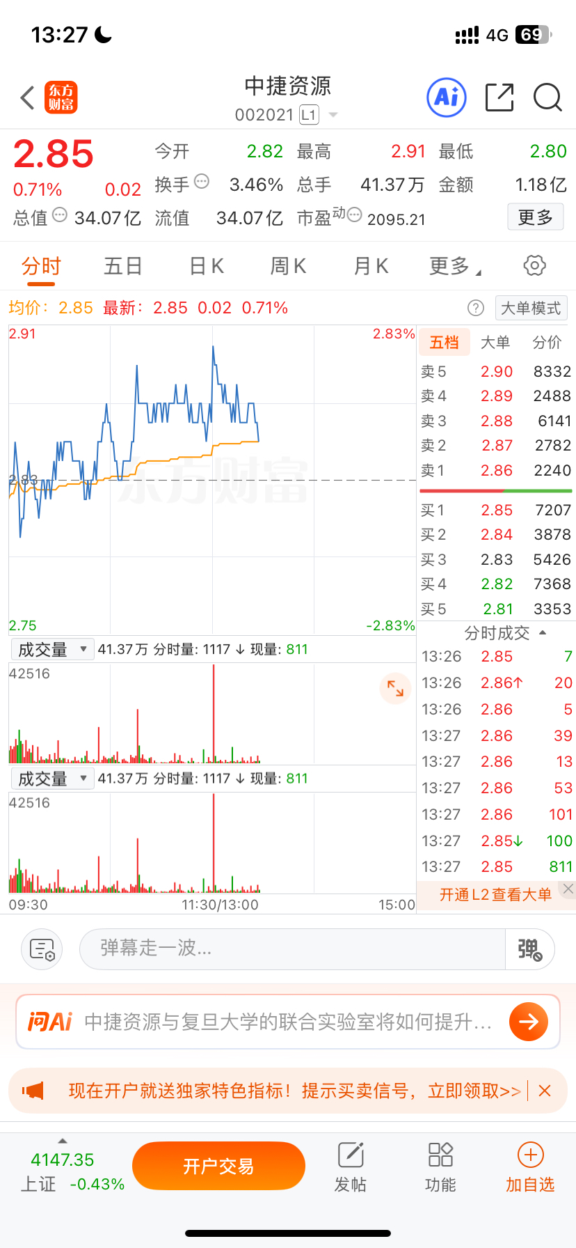 张敏操盘另外一只股票中捷资源,涨势喜人~
