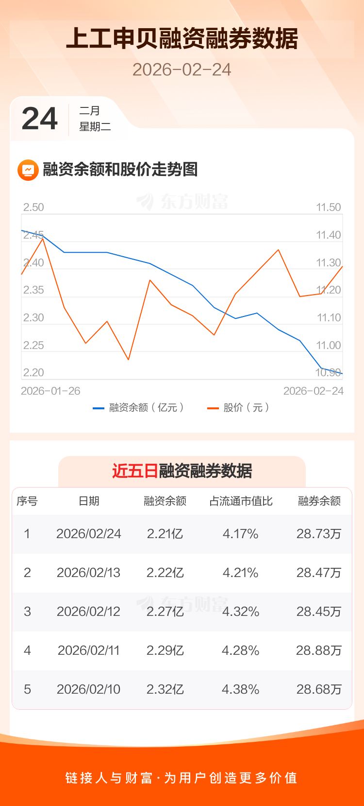 交易所最新数据显示,上工申贝于2026年2月24日获融资买入506.36万元,融资偿还541.32万元,当日融资净偿还34.96万元。目前,该股融资余额2.21亿,占流通市值比例为4.17%。