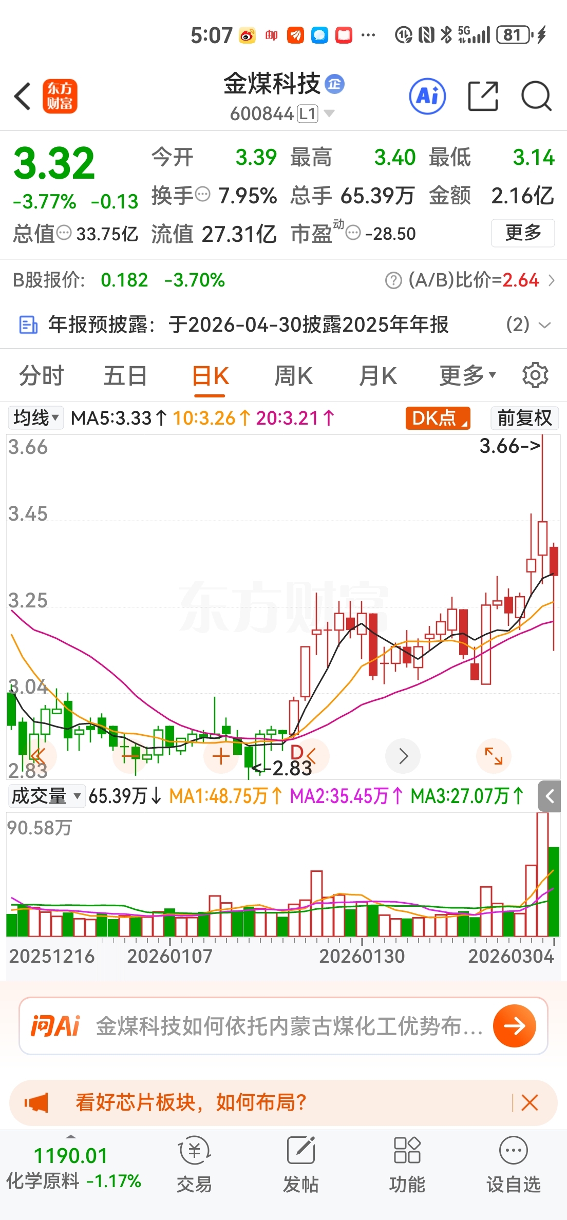 $金煤科技(SH600844)$ 丹化,出现揉搓线,开启补跌行情