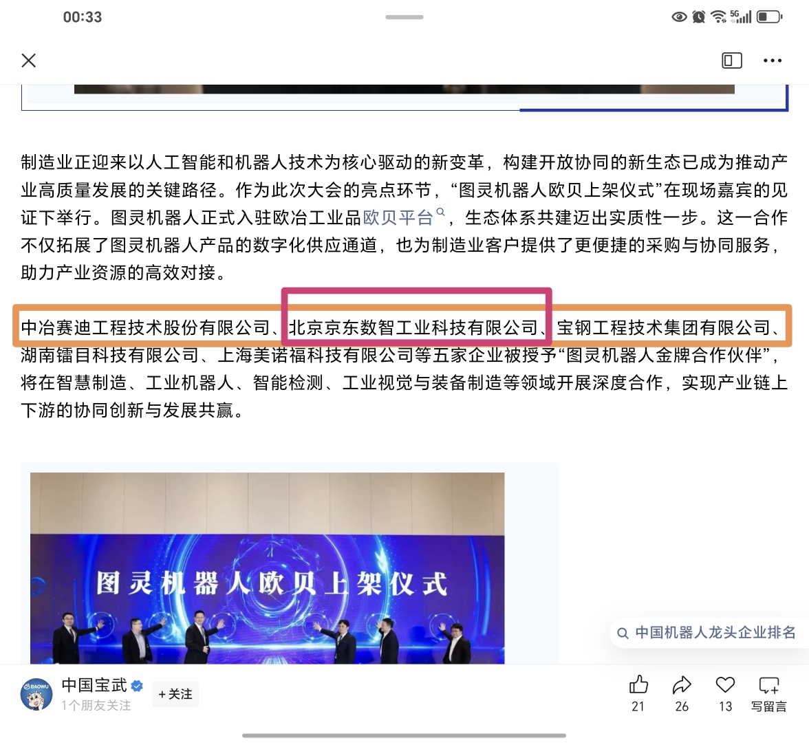 $宝信软件(SH600845)$ 图灵上市迟早的事,快就明年。图灵机器人根本不愁卖,金牌合作伙伴包括宝武、中冶两大央企。京东数智工业是大亮点,京东五年内准备采购300万台机器人,图灵机器人皮实耐操是干活的好手。宝信值得持有,走走看。。。
