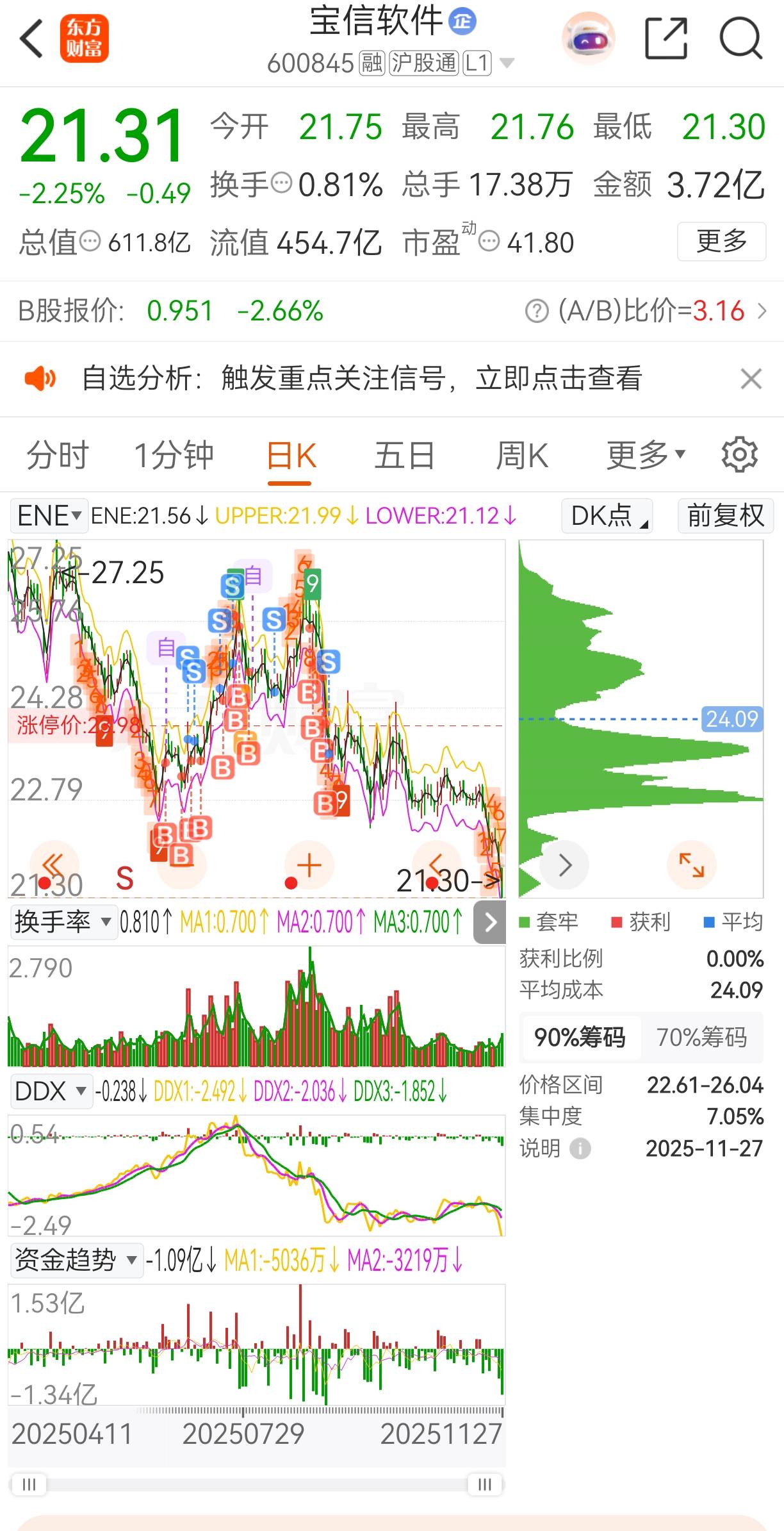 3. 后期收割:假利好+资金出逃完成套牢:到了2025年11月,这种收割更显残酷。11月25日公司披露与中智咨询的战略合作利好,但次日股价仅微跌0.4%,看似平稳,实则是主力利用利好稳住散户。11月26日该股创60日新低,收盘报21.8元(仍高于正常下跌趋势区间上限),当日主力资金净流出7040.12万元,近20日主力净流入累计为-2.83亿元。此时需特别提醒:即便股价进入8-12元正常下跌区间,也切记莫抄底——主力在此阶段仍可能通过持续抛售扩大跌幅,让抄底散户再次被套。最终,前期补仓的散户要么弹尽粮绝无力操作,要么因抄底新筹码陷入更深套牢,主力则通过持续资金流出完成最终收割。