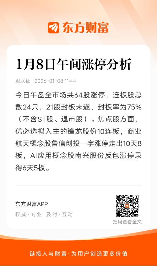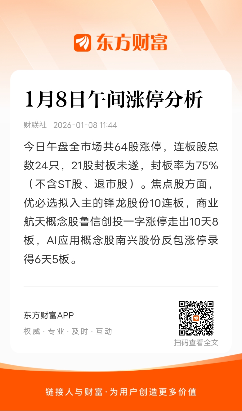 今日午盘全市场共64股涨停,连板股总数24只,21股封板未遂,封板率为75%(不含ST股、退市股)。焦点股方面,优必选拟入主的锋龙股份10连板,商业航天概念股鲁信创投一字涨停走出10天8板,AI应用概念股南兴股份反包涨停录得6天5板。