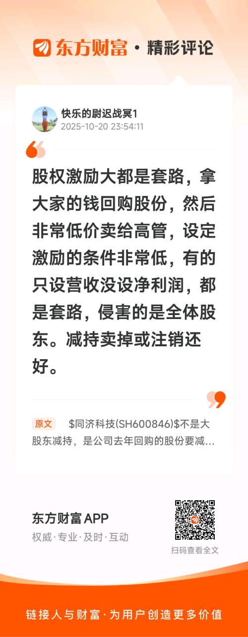 只要看到这种热心看多分析贴,就应该尽快清仓//@快乐的尉迟战冥1 :股权激励大都是套路,拿大家的钱回购股份,然后非常低价卖给高管,设定激励的条件非常低,有的只设营收没设净利润,都是套路,侵害的是全体股东。减持卖掉或注销还好。