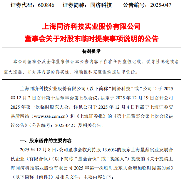公告称,公司于2025年12月2日召开第十届董事会第七次会议,决定于2025年12月19日召开公司2025年第一次临时股东大会。2025年12月8日,公司董事会收到量鼎合伙提交的《关于提请上海同济科技实业股份有限公司2025年第一次临时股东大会增加临时提案的函》(以下简称《函件》)及相关文件。
