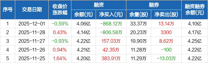 上海临港:融资净偿还868.12万元,融资余额4.06亿元(12-01)