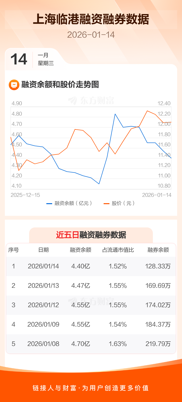 交易所最新数据显示,上海临港于2026年1月14日获融资买入3870.18万元,融资偿还4639.85万元,当日融资净偿还769.67万元。目前,该股融资余额4.40亿,占流通市值比例为1.52%。