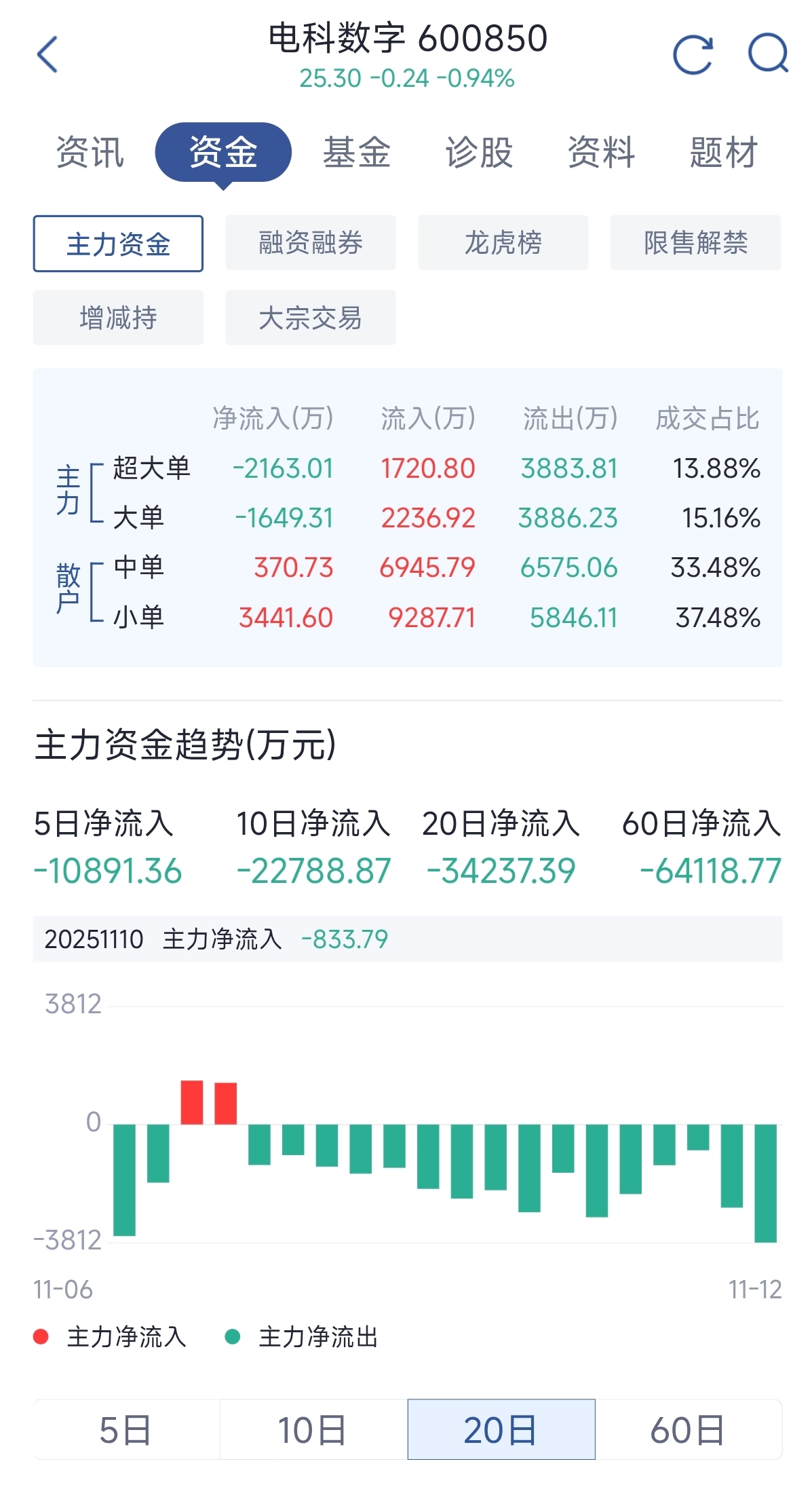 $电科数字(SH600850)$ 主力连续第16天出货,金额还不小,明日预测,主力继续出货3000万,股价24.9