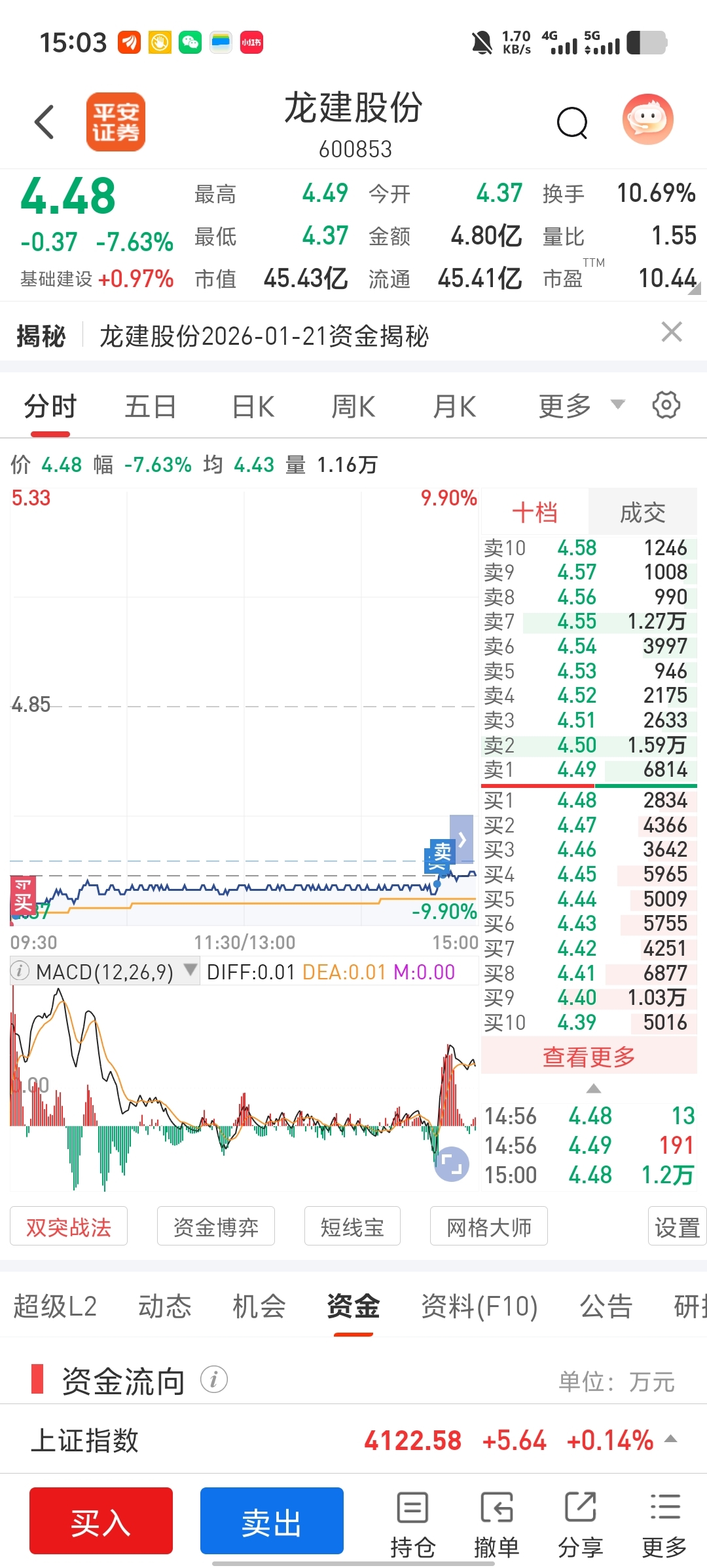 $龙建股份(SH600853)$ 发债前看好龙建,今天感觉有主力在吸筹,尾盘卖了不是害怕了,而为了明天有更多的资金做T,仓位基本还是昨天的仓位
