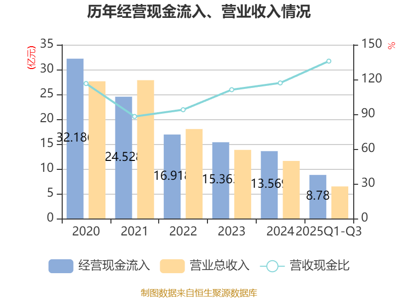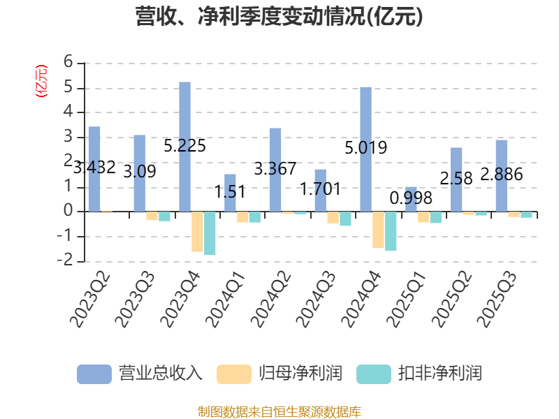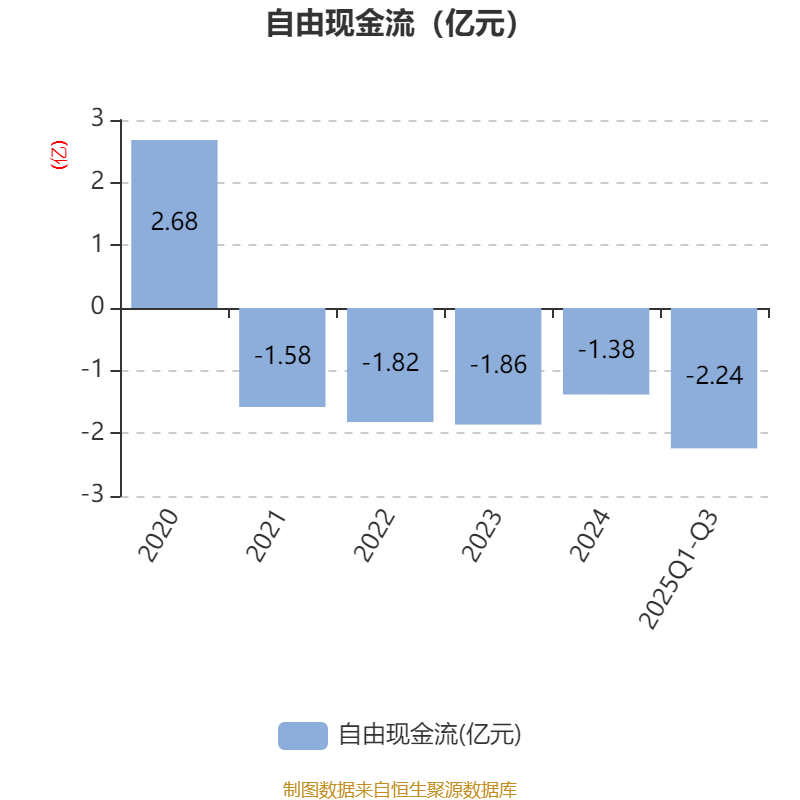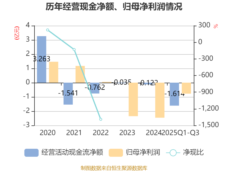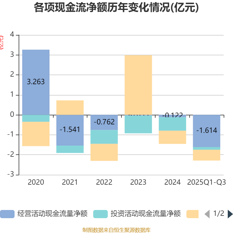 2025年前三季度,公司经营活动现金流净额为-1.61亿元,同比减少1.14亿元;筹资活动现金流净额-5424.25万元,同比增加599.24万元;投资活动现金流净额-1332.43万元,上年同期为-5238.2万元。