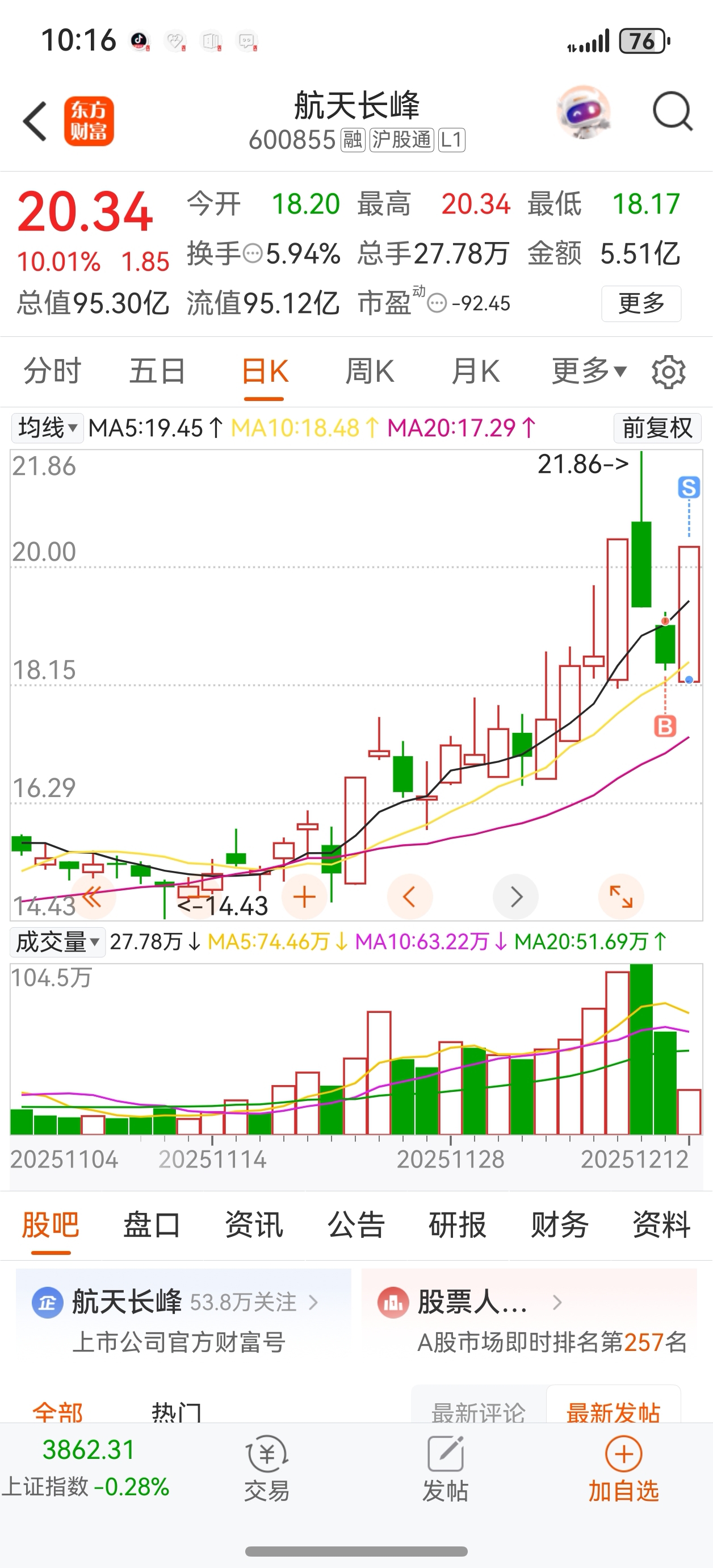 $航天长峰(SH600855)$ 我今天早上吃了没事去看了一下财经主播,说今天航空别接,我直接卖了!哎!怪自己不相信自己,每次吃面都是因为听别人的,按我自己的模式,天天大肉,真是气死了