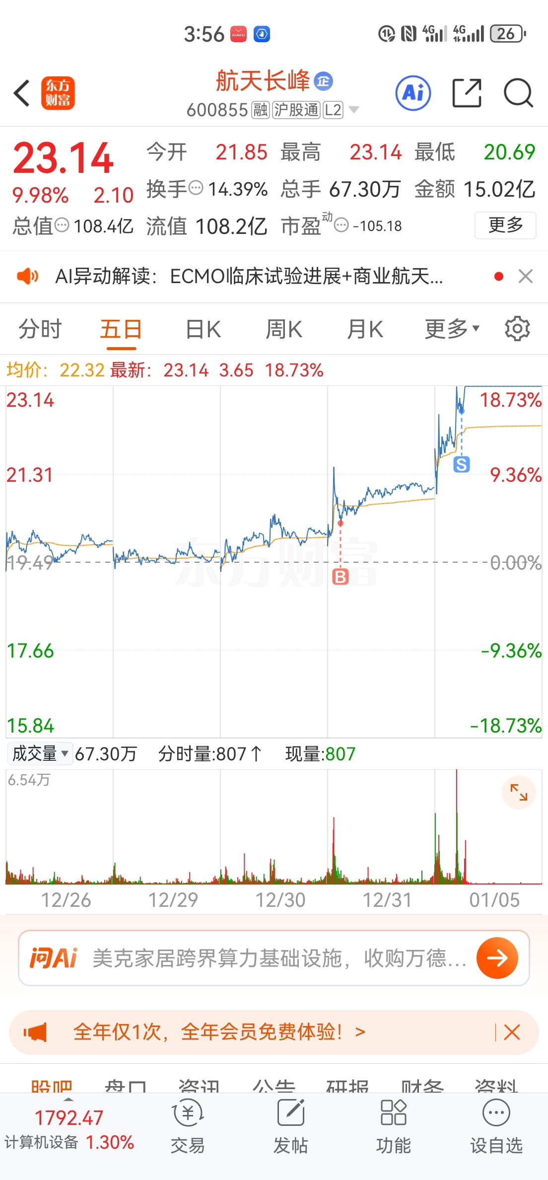 $航天长峰(SH600855)$ 智能说自己水平不行,一没管住自己就卖了