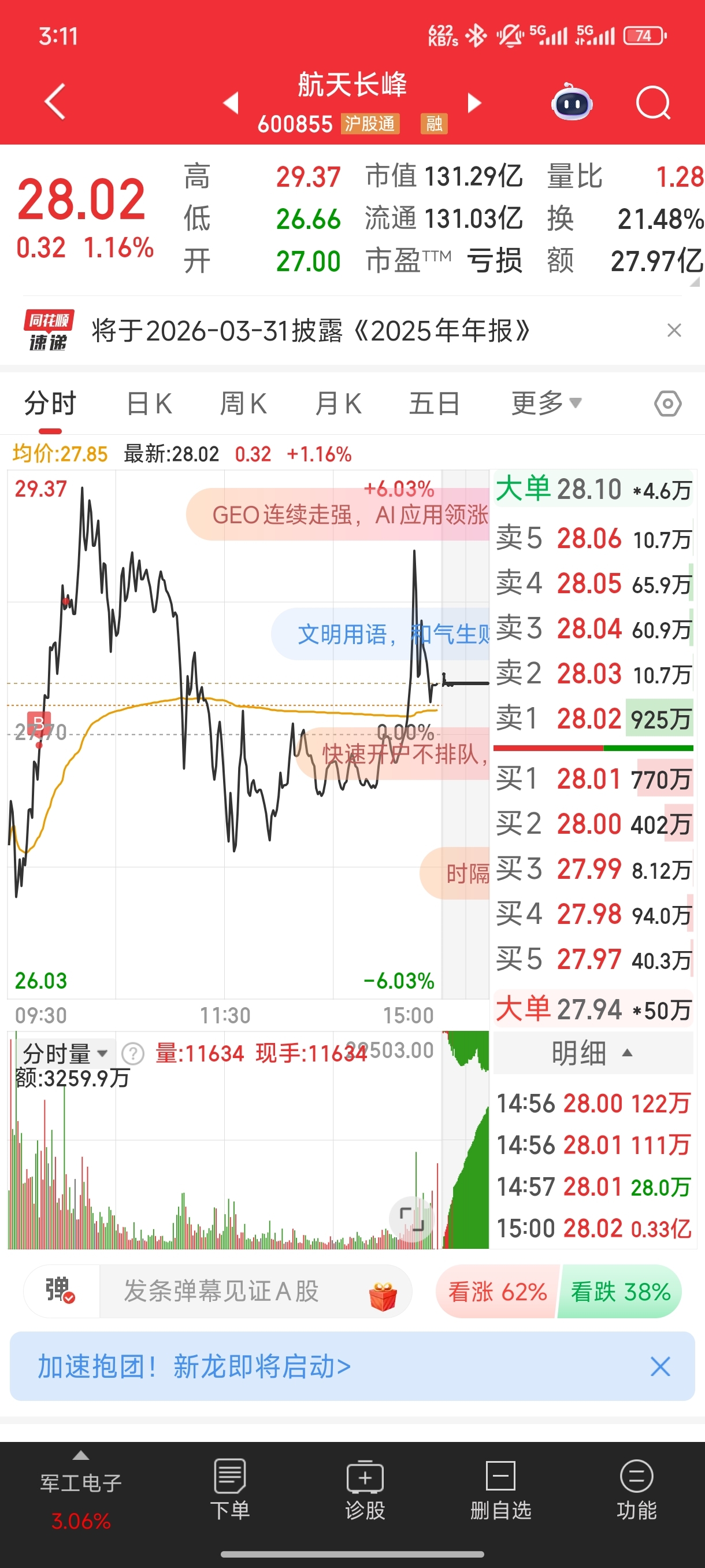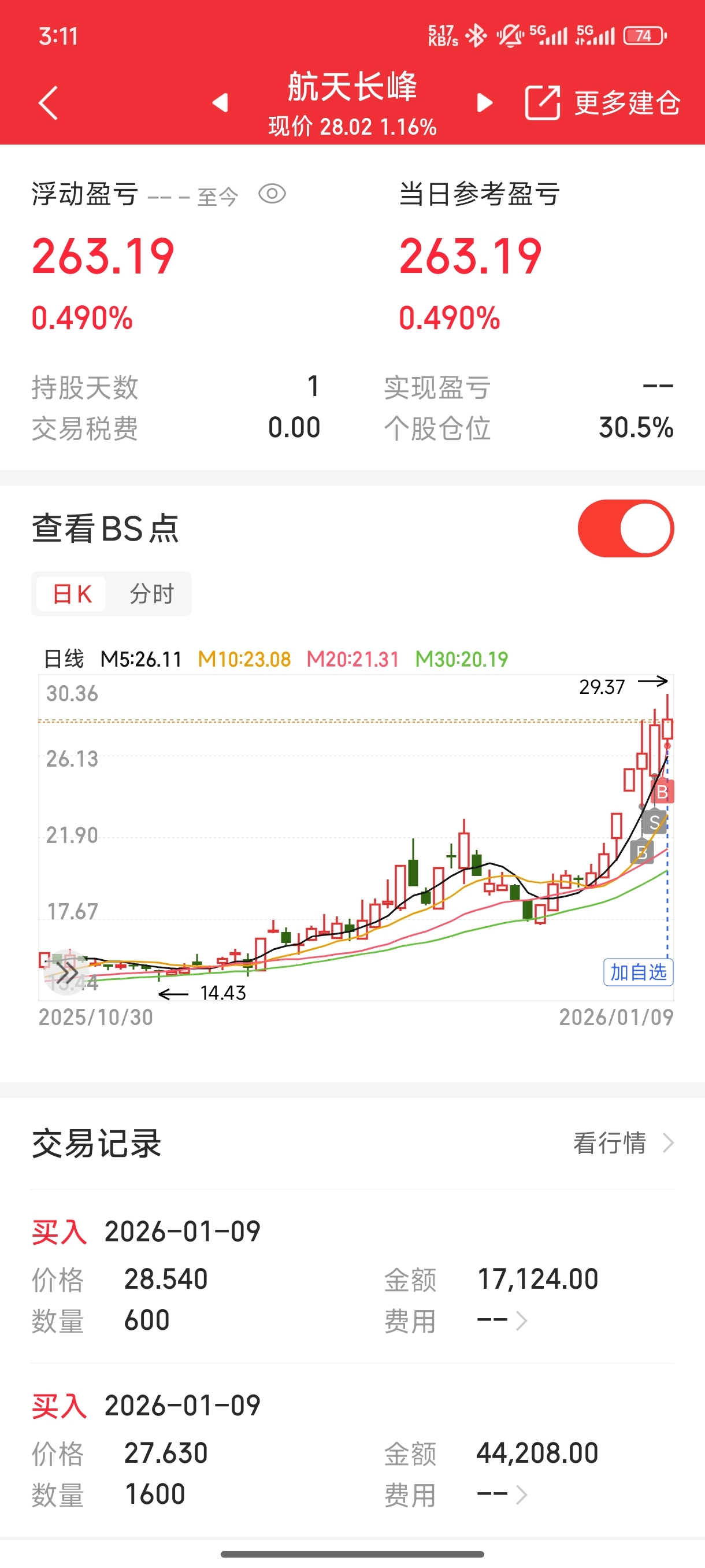 买了6万+,没亏钱就好,早盘航天电子拉太快就进了这个!盘中一度亏损1800,收盘