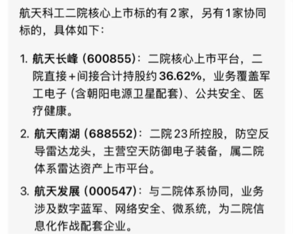 $航天长峰(SH600855)$$航天南湖(SH688552)$$航天发展(SZ