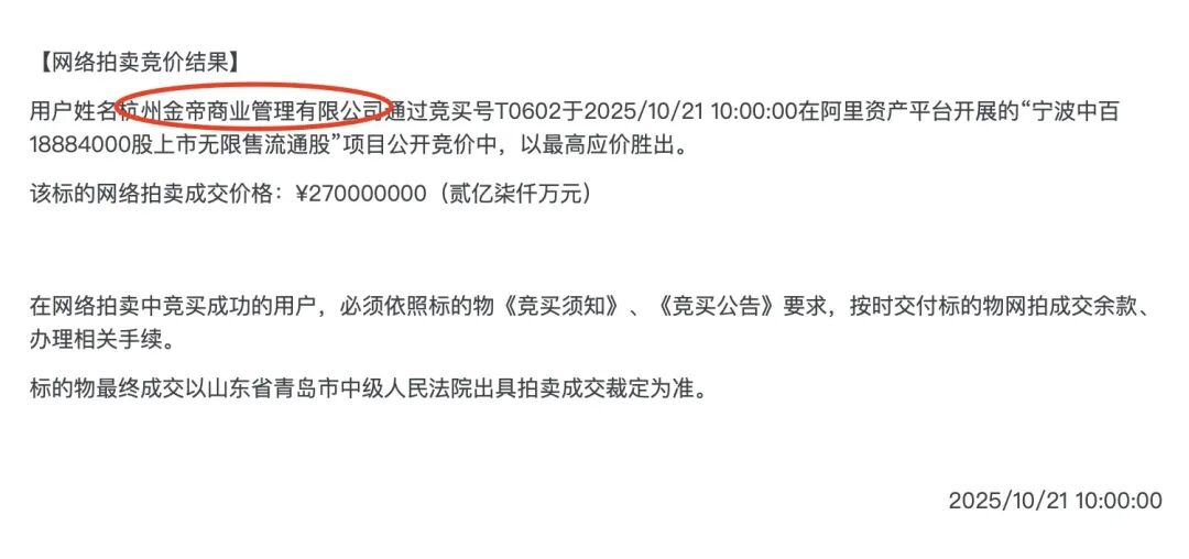 等待一个月之后,“徐翔家族”实控的宁波中百(600857)股东所持股份于10月21日被法拍成交,杭州金帝商业管理有限公司(以下简称“杭州金帝”)以2.7亿元竞得。