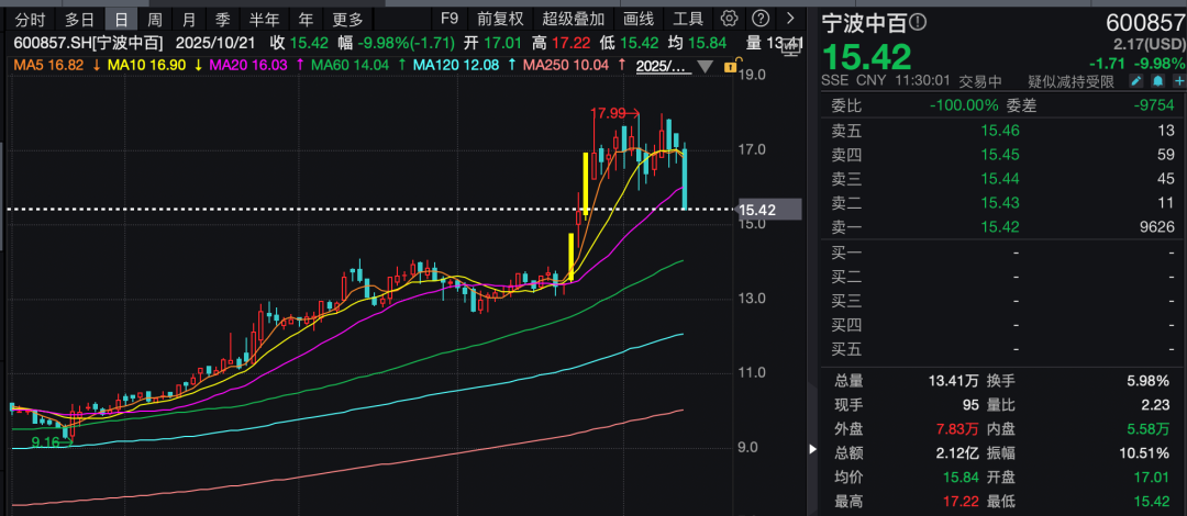但在今日10时法拍正式结束时,宁波中百股价却突然闪崩,很快就被砸在了跌停板上,股价跌至15.42元/股。