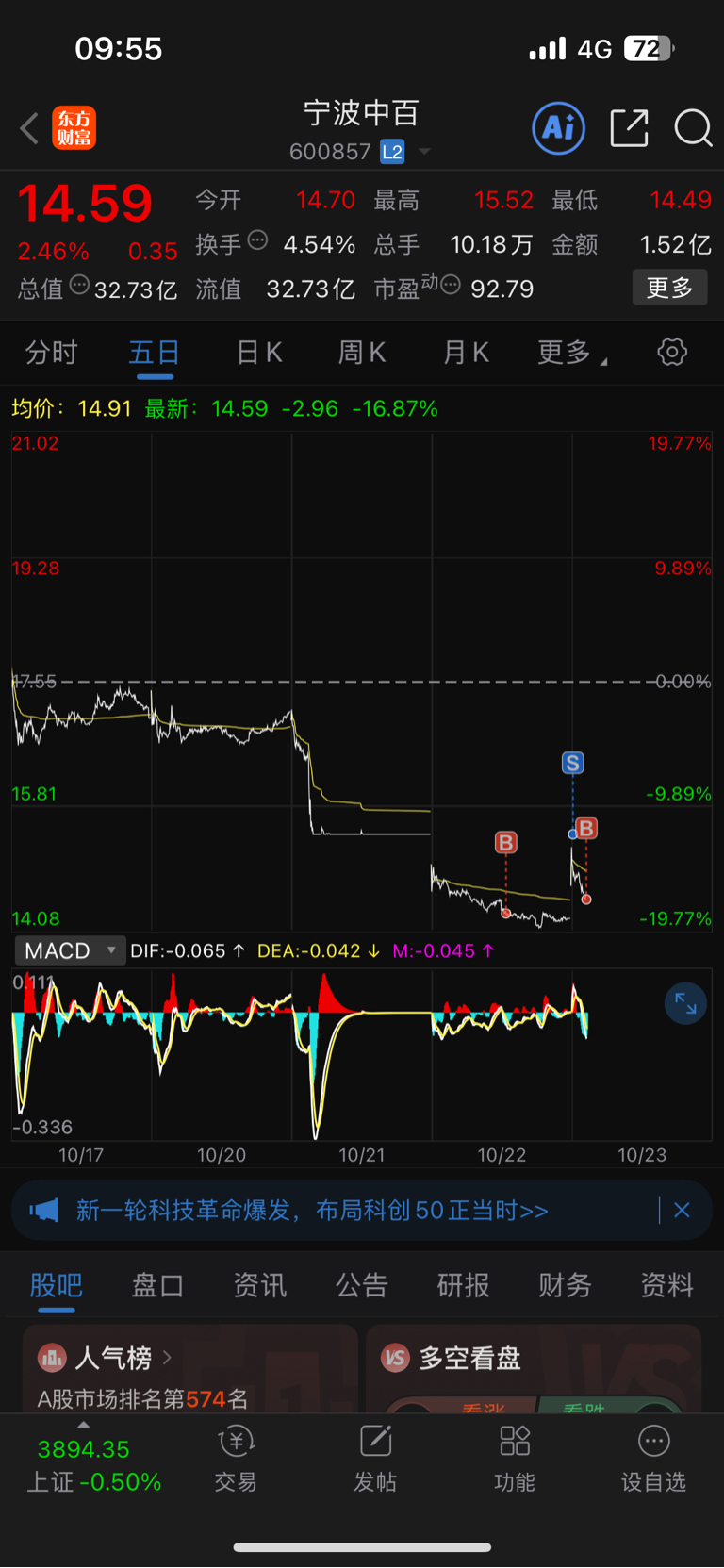 $宁波中百(SH600857)$ 昨天14.31买的,今天15.42卖了,刚刚14.51又抄进来了